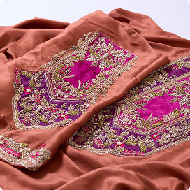 طقم مخملي بلون أزرق داكن عميق، مزين بتطريزات ذهبية رائعة على طول خط العنق. يتناغم انسيابية المخمل الفاخرة بشكل جميل مع التفاصيل المصنوعة يدويًا، مما يخلق إطلالة ملكية أنيقة وعصرية في آن واحد - مثالية للمناسبات المسائية والخاصة.